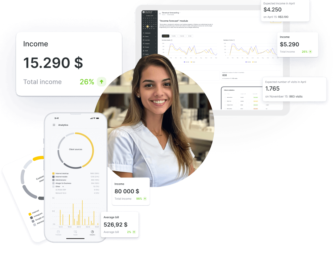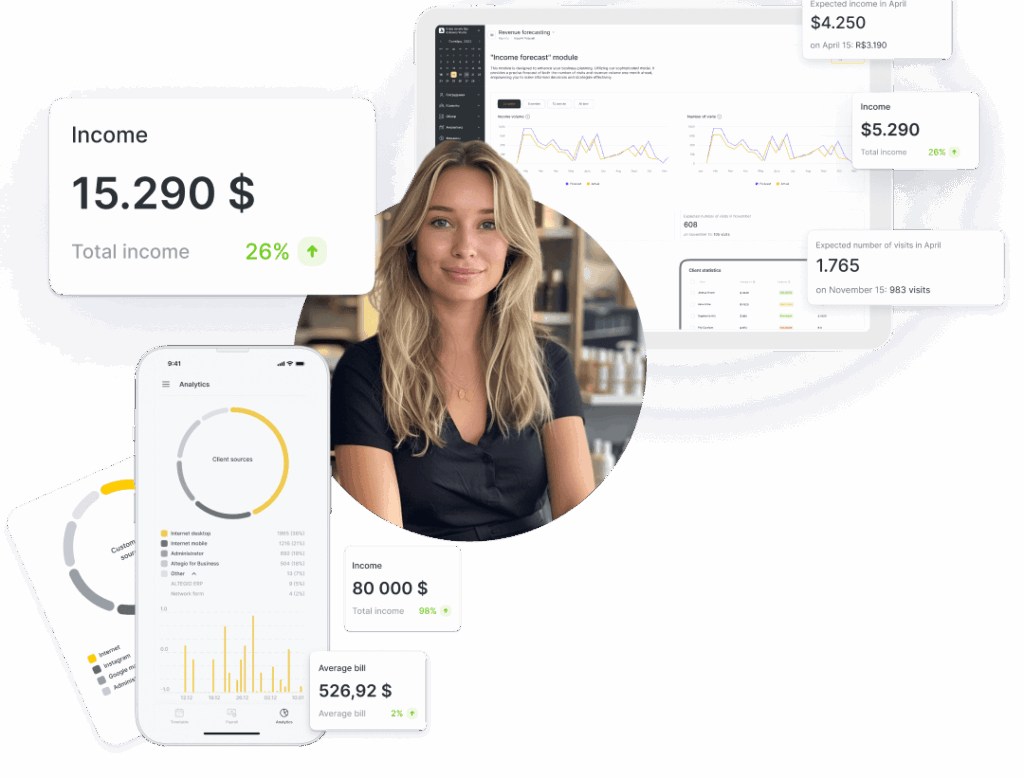 Altegio provides everything you need for marketing, sales, finance, and management, streamlining your operations and driving growth