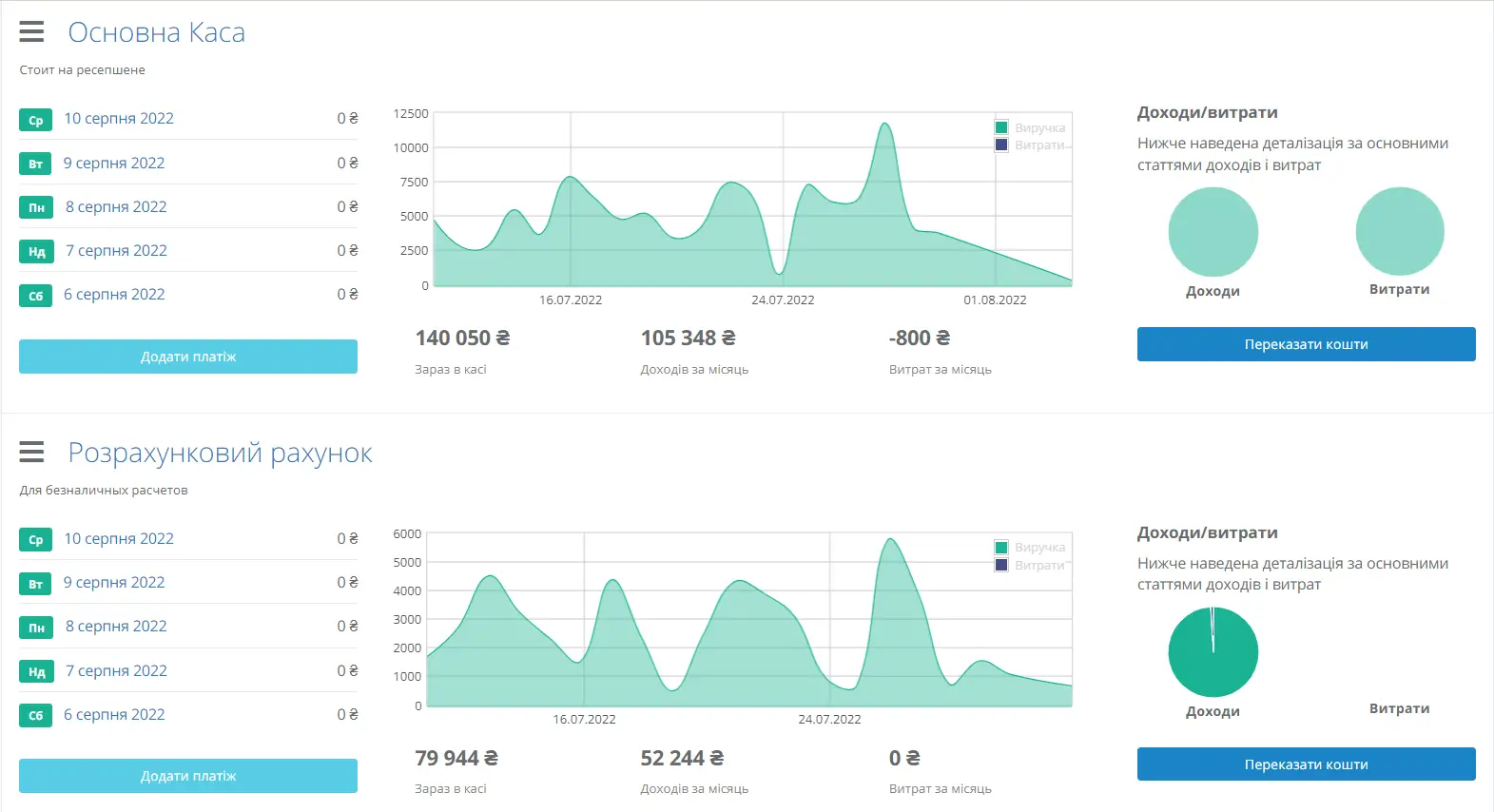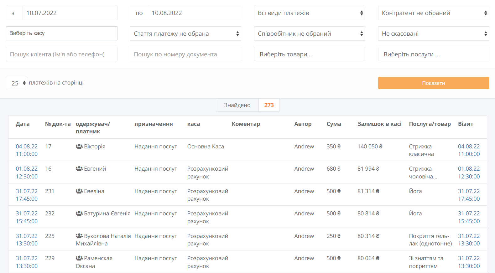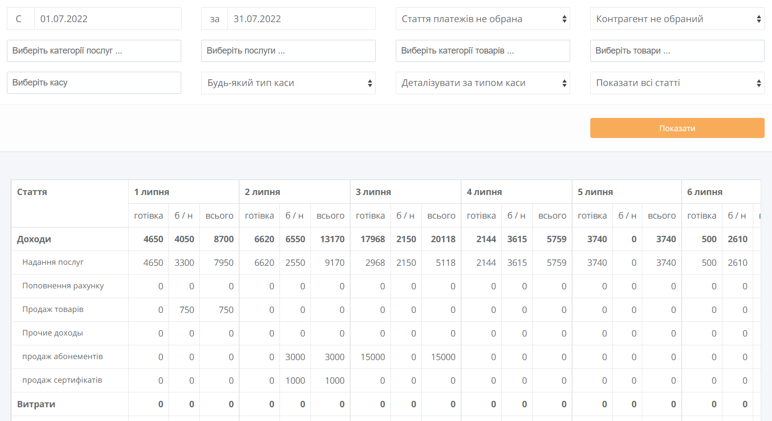 Accounting for all payments: cash, card, online payment, bonuses, sales to random customers off the street. Goods and services sales reports broken down by day or by selected time period, further separated by method of payment.