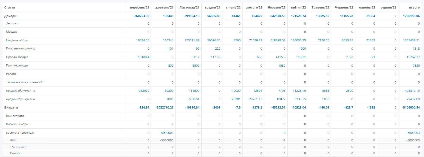 Expenses for purchases, staff salaries, as well as any added expense items. Use a clear visual display in numbers or graphs, which allows you to plan and build forecasts.