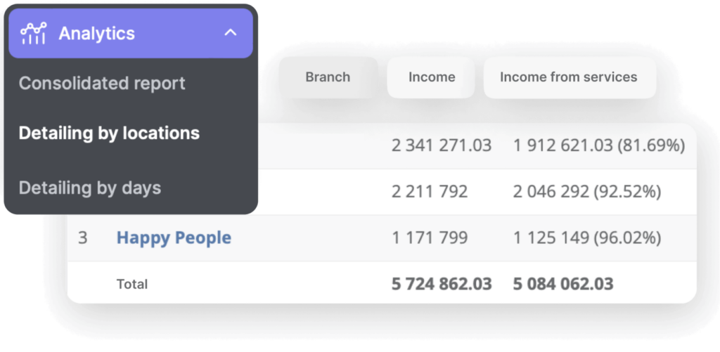 Lost clients for the network and specific branches are calculated differently. See how many customers stopped visiting the entire network and unique branches separately.