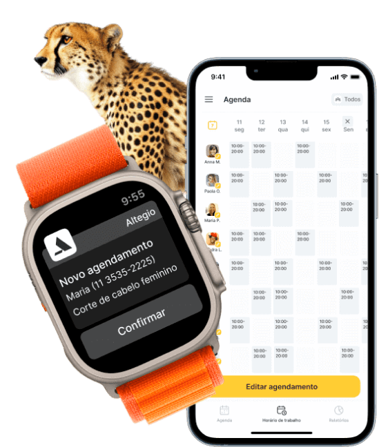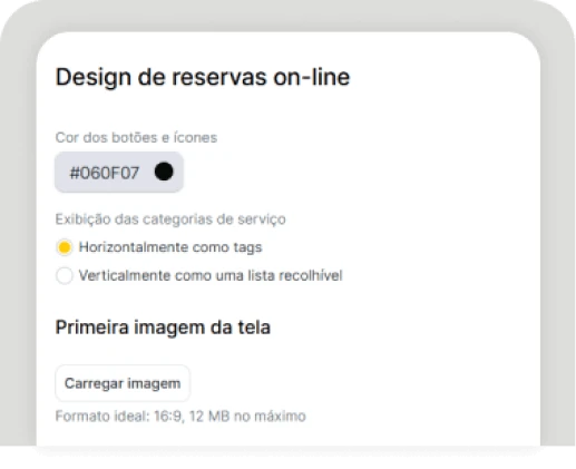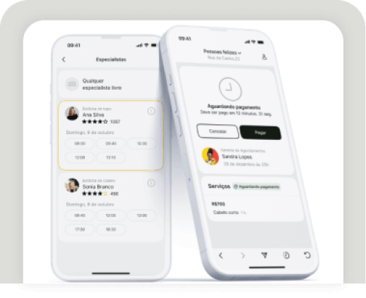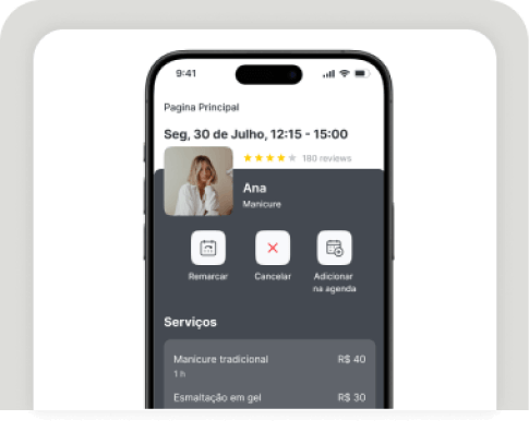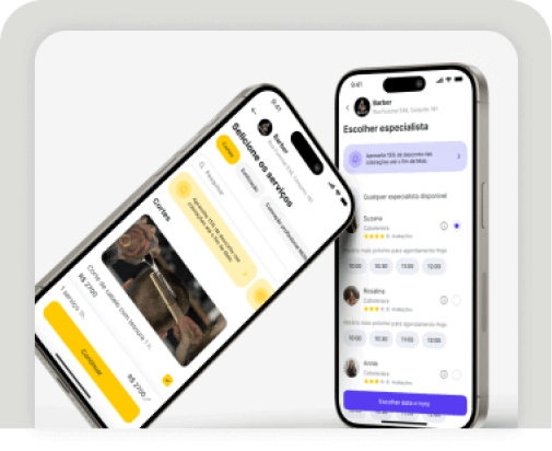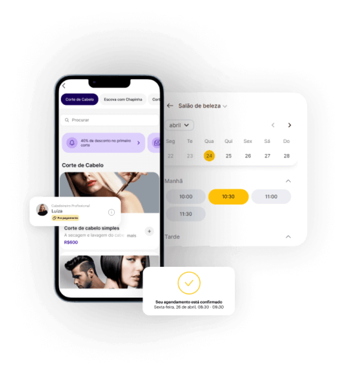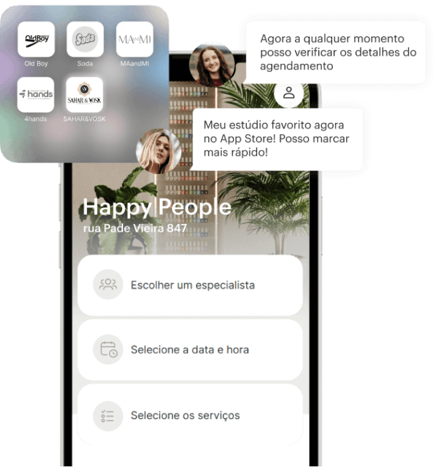 Personalize o aplicativo para o seu salão e a página de agendamentos, disponível na App Store ou Google Play, em apenas 30 minutos.